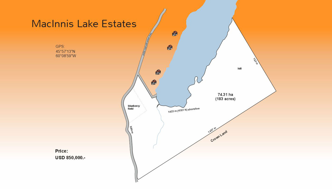 More land (approx. 124 acres/more than 50 ha), which we also own, could be purchased on the other side of the road to MacInnis Lake Estates. In approximately 1.5 miles distance, we also own a much larger acreage on a completely secluded lake which could also be purchased. We call this second property “Seven Peninsula Estates” and it also can be found in our portfolio. Both properties could make together a very unique combination as one is close to civilization and the other one very private.